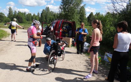 PC-12(951k)、02:18着 (7月9日) 両足の痛みに耐えながらずぶ濡れになって到着。泥道の中を進み、森の開けた場所のキャンプ場のような所にある崩れかけたトレーラーハウスがPCだった。 階段を上がるのさえ辛く、食事をしてテントで倒れこむように眠る。クローズは06:20、2時間程寝て5時頃には出発する。 走行アベは落ちるばかり、少しでも余裕を残しておかないとゴールクローズに間に合わないかもしれない。次のPCまでアベ15kと目標を決める。 幸い雨は上がり、途中で雨具を脱ぎ身軽になる。 穴こそないが微妙に振動がありスピードが出ない。それでも白線と路肩の間の3-40センチの間のわずかないいところを選んで走るが、路肩は土なので外れるとバランスを崩す。 左膝と右足首の痛みはますますひどくなり、このあたりは泣きながら走っていた。途中からアップダウンのある森の中に入り、町に入る手前の踏み切りで今泉さんと出会う。 一瞬「なんで?」と思うが、ここは折り返しだった事に気づく。 ここで、PC-13はGPSの3k手前を右折した場所に変更になった事、またPC-14は4k先になった事、どちらも案内版(紙に書いてあるだけだが)さえ見落とさなければわかると教えられる。 今泉さんはあいにく夜中で雨が降っていたのでわからず最初のポイントに行って1-2時間途方にくれていたらしい。お互いこの先の健闘を称えて分かれる。 PC-13(1064k)、12:38着 町を抜けた森の中のPCに到着、食事をして足が痛いので氷がないか尋ねてみるがそれは無理だった。かわりにボルタレンの塗り薬があるというので借りて塗る。 次のPCまでアベ14kと設定。足首の痛みは少しだが良くなってきた、しかし膝の痛みは頂点に達し何度も停まっては走り、走っては停まるの繰り返し。 アベ14kも厳しいかもしれない。おまけにまた道は穴だらけで、かなりの勾配の坂が続く。 坂の途中で停まっているとスタッフカーが止まって「大丈夫か?」と聞いてくる。「わからないが、なんとかやってみるよ。」みたいなことを言った、と思う。 ペダルを廻す最初の一踏みがとにかく痛い、激痛に耐えて思い切って廻すとだんだん痛みが薄らいでくる。 なのでくるくる廻し続けているときはいいが、廻しきれず一旦止めたり歩いたりした後の一踏みがこたえる。その繰り返しが延々と続く。 日本ならとっくにやめていただろう、しかしここはロシア、とにかく少しでもゴールに近づくしかない。たとえ時間内にゴールできなくても、、、、。 ロシアの空はどこまでも青く、しかし道は悪い。 |